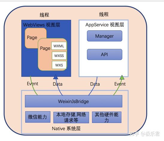 也就是说,两个『模块/线程』是通过系统层的JSBridage来通信的,逻辑层把数据变化通知到视图层,触发视图层页面更新,视图层把触发的事件通知到逻辑层进行业务处理。可参考下图: